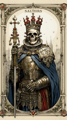 © Nastassia, Fototapeta premium Dark Occult Tarot Card Featuring a Skeleton in Armor