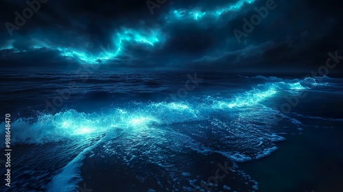 © Indronath, Fototapeta premium Dark ocean glowing waves illuminated by neon lit sky peaceful scene picture