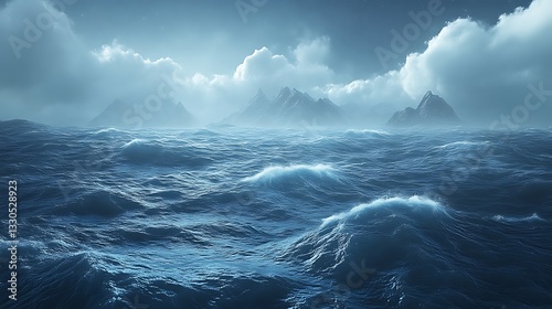 © Murih, Fototapeta premium Dark Ocean Waves Crashing Against Distant Mountains