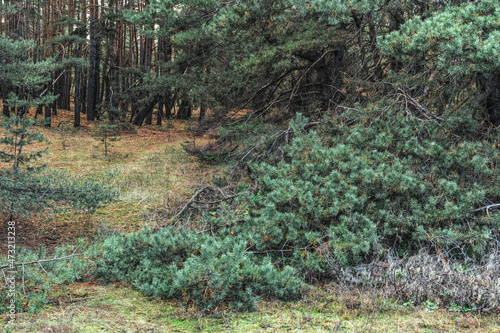 © Maryna Konoplytska, Fototapeta premium Dark old mysterious pine forest