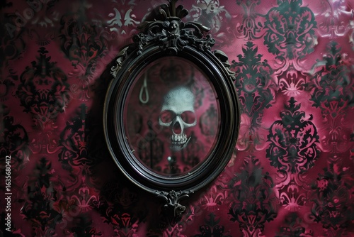 Obraz premium Dark ornate mirror reflecting a skull against a rich red damask wallpaper, creating a haunting atmosphere with intricate patterns and eerie ambiance, perfect for horror-themed design