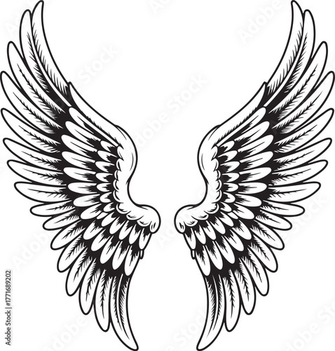 Obraz premium Dark Outlined Angel Wings Illustration Spreading Wide on Checkerboard Pattern...