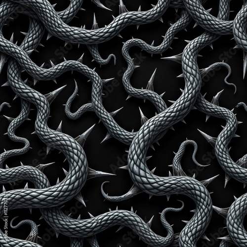 © Pete, Fototapeta premium Dark pattern of twisted metal vines with sharp thorns. Intricate design suggests danger, power. Abstract plant forms create gothic style backdrop. Suitable for various decorative projects. Graphic