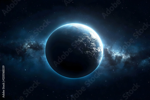 Fototapeta premium Dark Planet Shines in the Cosmic Night with Glowing Atmosphere and Distant Stars