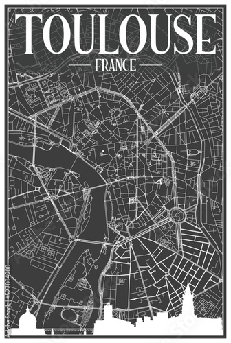 © Momcilo, Fototapeta premium Dark printout city poster with panoramic skyline and hand-drawn streets network on dark gray background of the downtown TOULOUSE, FRANCE