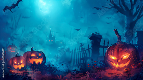 Naklejka premium Dark pumpkin patch at twilight with scarecrows and autumn leaves.