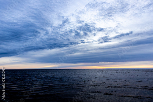 © Emvats, Fototapeta premium Dark rain clouds over sea horizon at sunset