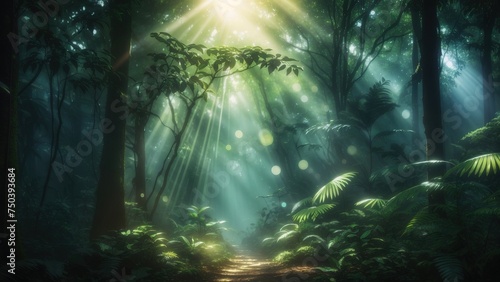 © WrongWay, Obraz premium Dark rainforest, sun rays through the trees