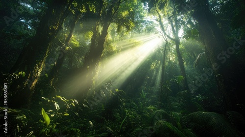 Fototapeta premium Dark rainforest, sun rays through the trees, rich jungle greenery