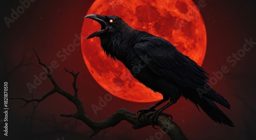 © Hungarian, Fototapeta premium Dark raven perches on a bare branch against a brilliant crimson lunar sphere