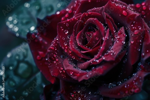© Oleksandr, Naklejka premium Dark Red Rose Blooming on Bright Day with Water Drops- Beautiful and Big