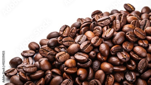 © Sayfar, Naklejka premium Dark roasted Arabica coffee beans on white background with copy space, forced perspective