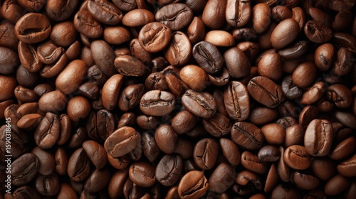 Naklejka premium Dark roasted coffee beans creates textured background. Ideal for themes related to coffee, beverages, cafes, breakfast, energy, natural organic products, highlighting rich aroma, robust flavor.