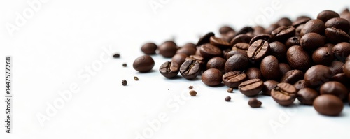 Naklejka premium Dark roasted coffee beans form a border on pure white background , brown, product