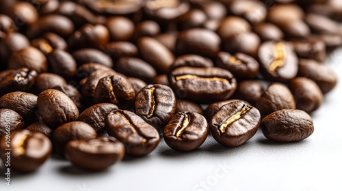 Naklejka premium Dark roasted coffee beans glisten with oils, awaiting the perfect brew for...