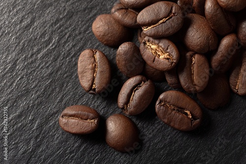 © Oleg, Naklejka premium Dark roasted coffee beans scattered on a slate surface ready for brewing