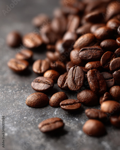 © NanoStudio, Naklejka premium Dark roasted coffee beans scattered on stone surface create an inviting aroma
