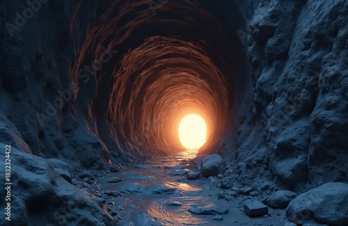 © miss irine, Fototapeta premium Dark rock tunnel entrance with bright light glow at end. Rocky path leads through cavern with water pools reflecting warm orange illumination. Underground passage way.