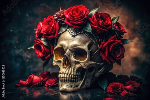 © kansak01, Naklejka premium Dark romanticism blooms: skull roses and gothic elegance intertwine in this editorial fashion shoot.