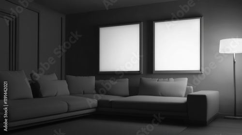 © matoya, Fototapeta premium Dark room, sofa, blank frames, mockup, interior design