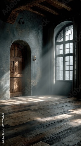 © Warna, Fototapeta premium Dark room, sunlight, arched doorway