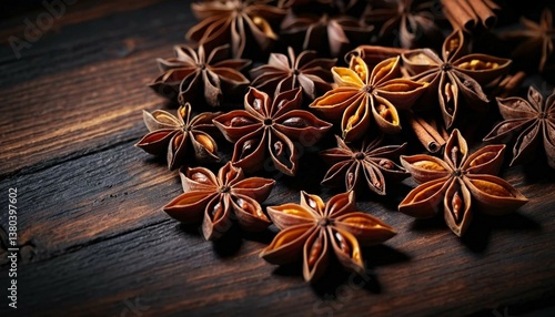 © Shinta, Fototapeta premium Dark Rustic Wood Background with Star Anise and Cinnamon Sticks