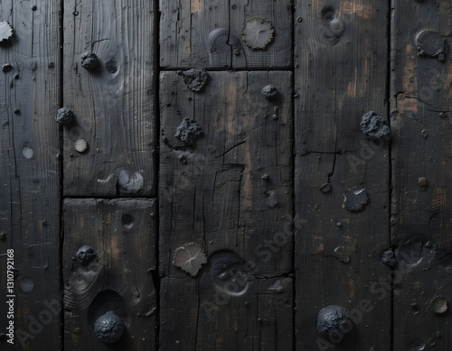 Fototapeta premium Dark rustic wooden planks with a weathered texture. Aged black wood with natural knots, cracks, and grain patterns. Perfect for backgrounds, textures, and design elements.
