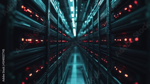 Fototapeta premium Dark Server Room Corridor With Red Lights Illuminating Servers