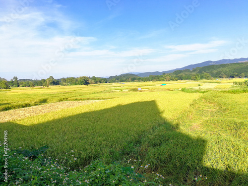 Fototapeta premium dark shadow on fresh golden and green organic rice tree in thailand farming.season harvest organic plant in summer season.