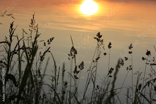 Obraz premium dark silhouette of grass on a blurred background of water. Beautiful abstract...