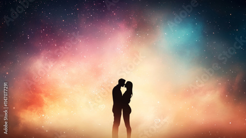 © Bonsales, Fototapeta premium Dark silhouette of lovers embracing, kissing under starry nebula sky, heart-shaped celestial backdrop creating romantic cosmic scene