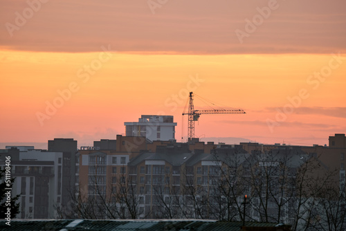 Fototapeta premium Dark silhouette of tower cranes at high residential apartment buildings...