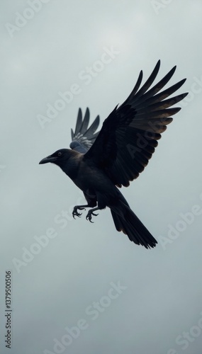 Fototapeta premium Dark silhouetted bird crow in flight against pale grey background, crow,...