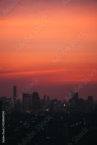 Obraz premium Dark silhouettes of Bangkok's buildings rising against an expressive, intense orange sunset sky, creating a dramatic urban landscape, Thailand