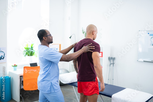 © Viacheslav Yakobchuk, Fototapeta premium Dark-skinned sports therapist standing near his visitor