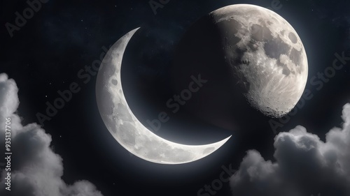 © Saad, Fototapeta premium Dark sky with close-up waxing crescent moon