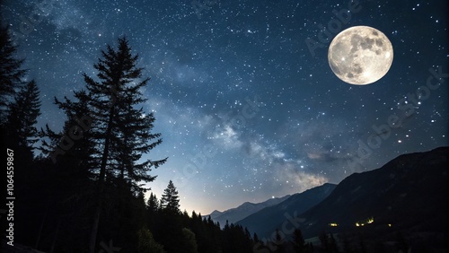Fototapeta premium Dark sky with multiple stars twinkling against a bright full moon, night sky,...