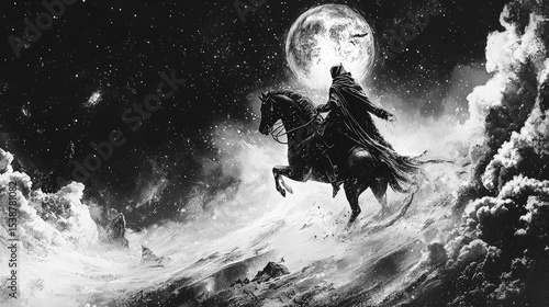 © Andi, Obraz premium Dark, snowy landscape depicts a figure on a steed.