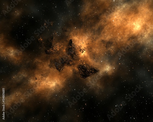Obraz premium Dark space with glowing clouds and rocky asteroid structures
