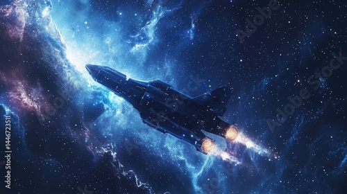 © Andi, Obraz premium Dark spaceship soaring through nebulae in deep space.
