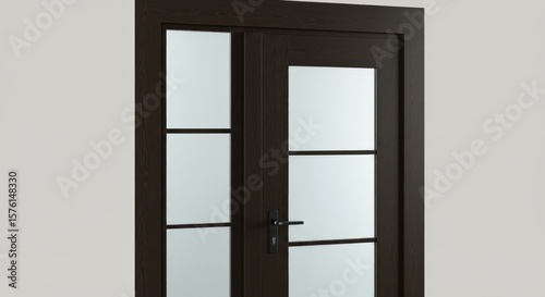 Obraz premium Dark stained wooden double doors with glass panels, framed in a neutral wall. Hardware visible. Clean lines and modern aesthetic