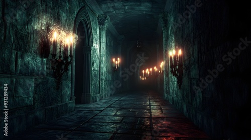 © Phichaphat, Obraz premium Dark Stone Corridor with Candlelight