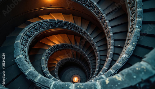 © Irina, Obraz premium Dark stone spiral staircase in an ancient tower with intricate designs illuminated by ambient dusk light