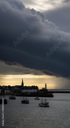 © Canities, Fototapeta premium Dark storm clouds gather over a coastal town with fishing boats in the harbor