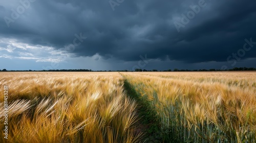 Fototapeta premium Dark storm clouds loom over a golden wheat field in the countryside during...