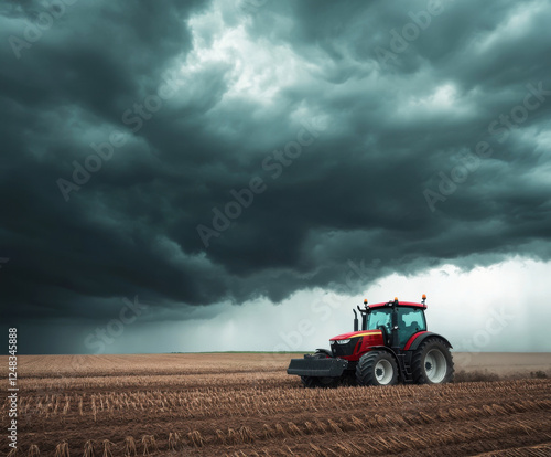 © CaptureCollabStudios, Obraz premium Dark storm clouds loom over a tractor working in a freshly plowed field at dusk