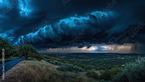 © Selvi, Fototapeta premium Dark Storm Clouds Roll Over Scenic Landscape, Dramatic Rain, Nature's Fury Unleashed, Impressive Vista, Breathtaking View