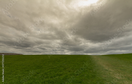 Fototapeta premium Dark stormy clouds over a green grass field