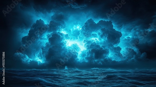 Fototapeta premium Dark stormy ocean, glowing blue clouds.