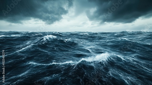 © Phirakhup, Fototapeta premium Dark stormy ocean waves under dramatic clouded sky, turbulent and moody atmosphere.